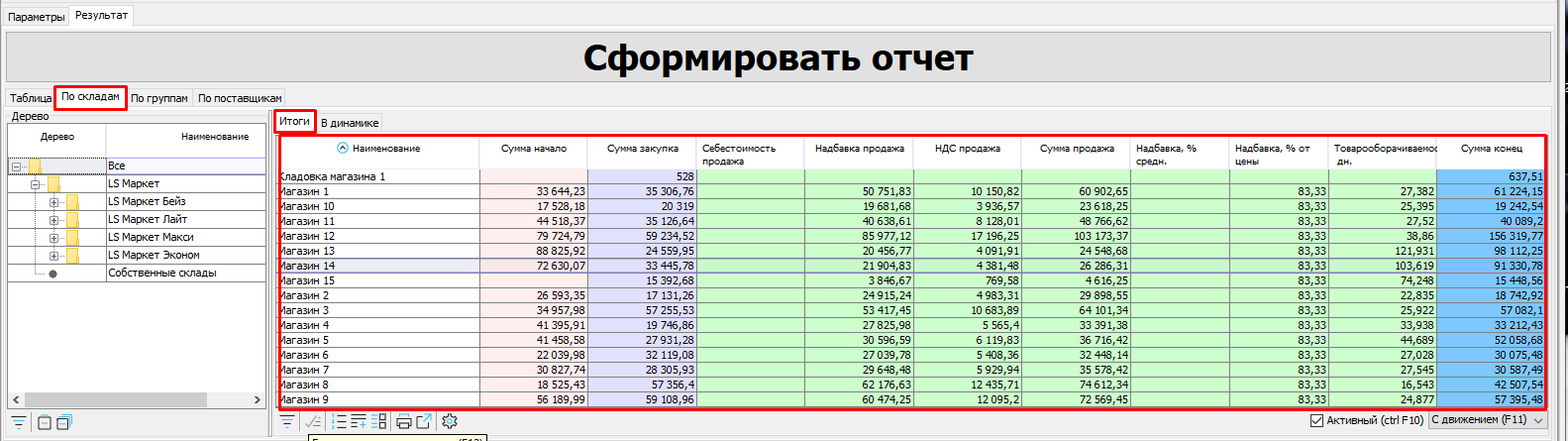 На вкладке "По складам\Итоги" выбранные показатели подсуммированы для каждого магазина. При выставленном признаке "В динамике", на вкладке"В динамике" показатели будут отражены не только по складам, но и по дням, входящим в выбранный период.