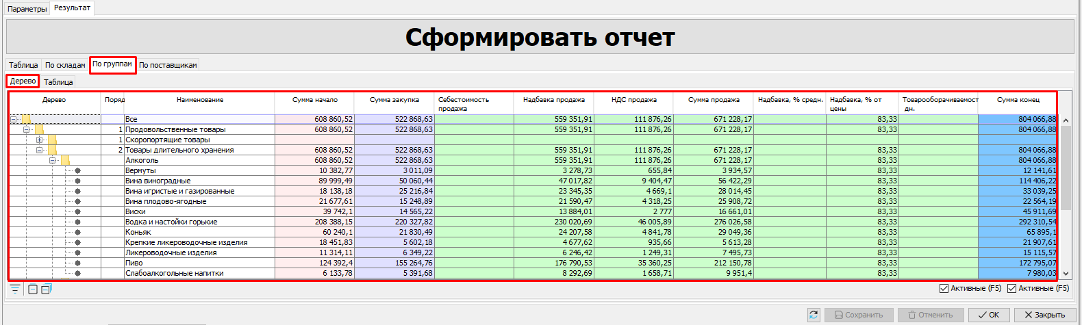На вкладке "По группам\Дерево" выбранные показатели подсуммированы для каждого подгруппы.