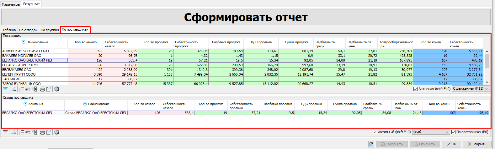 При выставленном признаке "По партиям", на вкладке"По поставщикам" будут отражены показатели, которые подсуммированы по поставщикам.