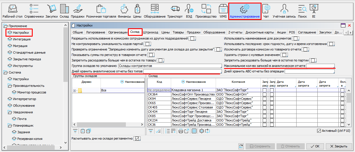 Для того, чтобы ограничить возможную нагрузку на сервер, при формировании Аналитического отчета на форме Администрирование\Приложение\Настройках\вкладка "Склад" в поле "Максимальное кол-во записей в аналитическом отчете" можно указать допустимый лимит. Также можно задать количество дней для хранения отчетов, сформированных вручную (без типов) - поле "Дней хранить аналитические отчеты без типов".