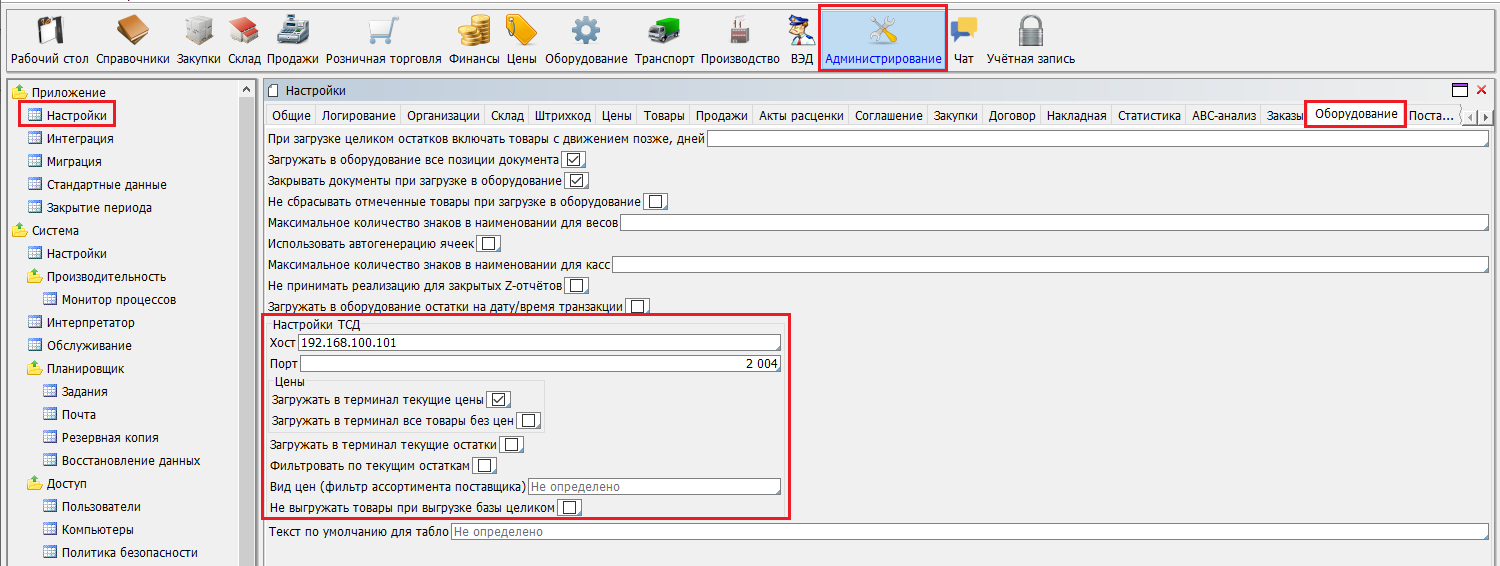 Основные настрой для ON-LINE режим производятся на форме Администрирование\Настройки\вкладка Оборудование\блок Настройки ТСД  (рис.5).
