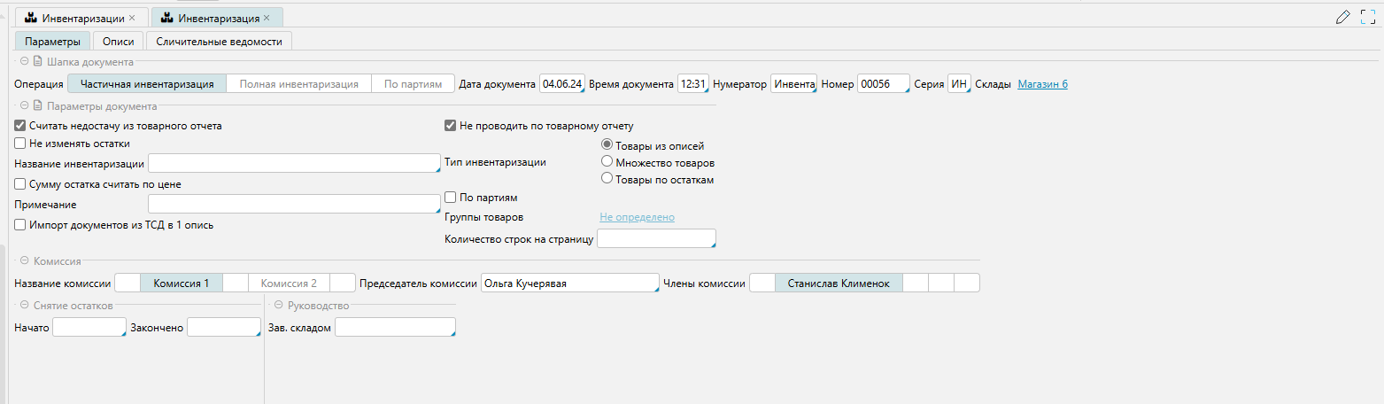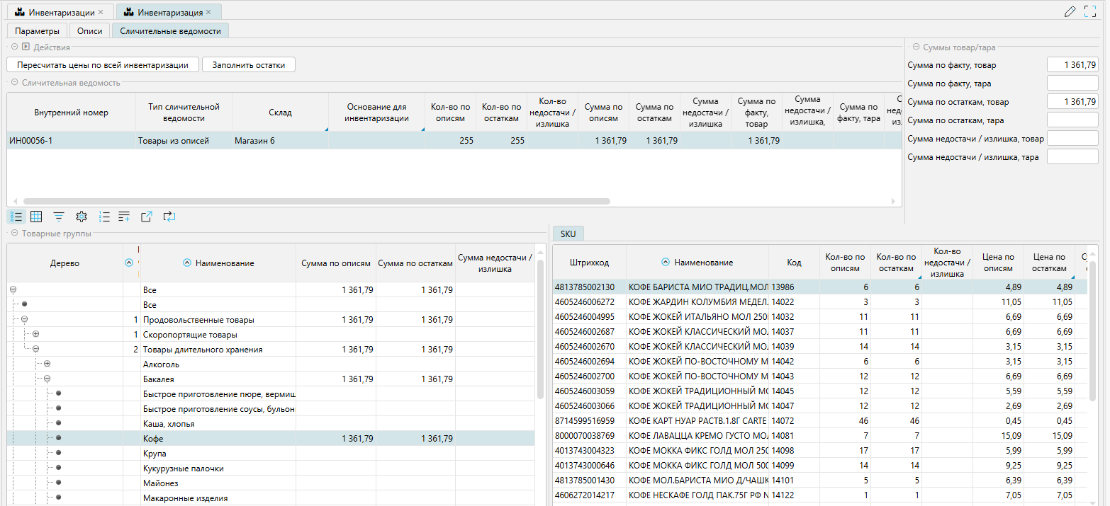 Ручная инвентаризация по нескольким товарам (корректируется кол-во товара из описей, остальные не задействованы)
