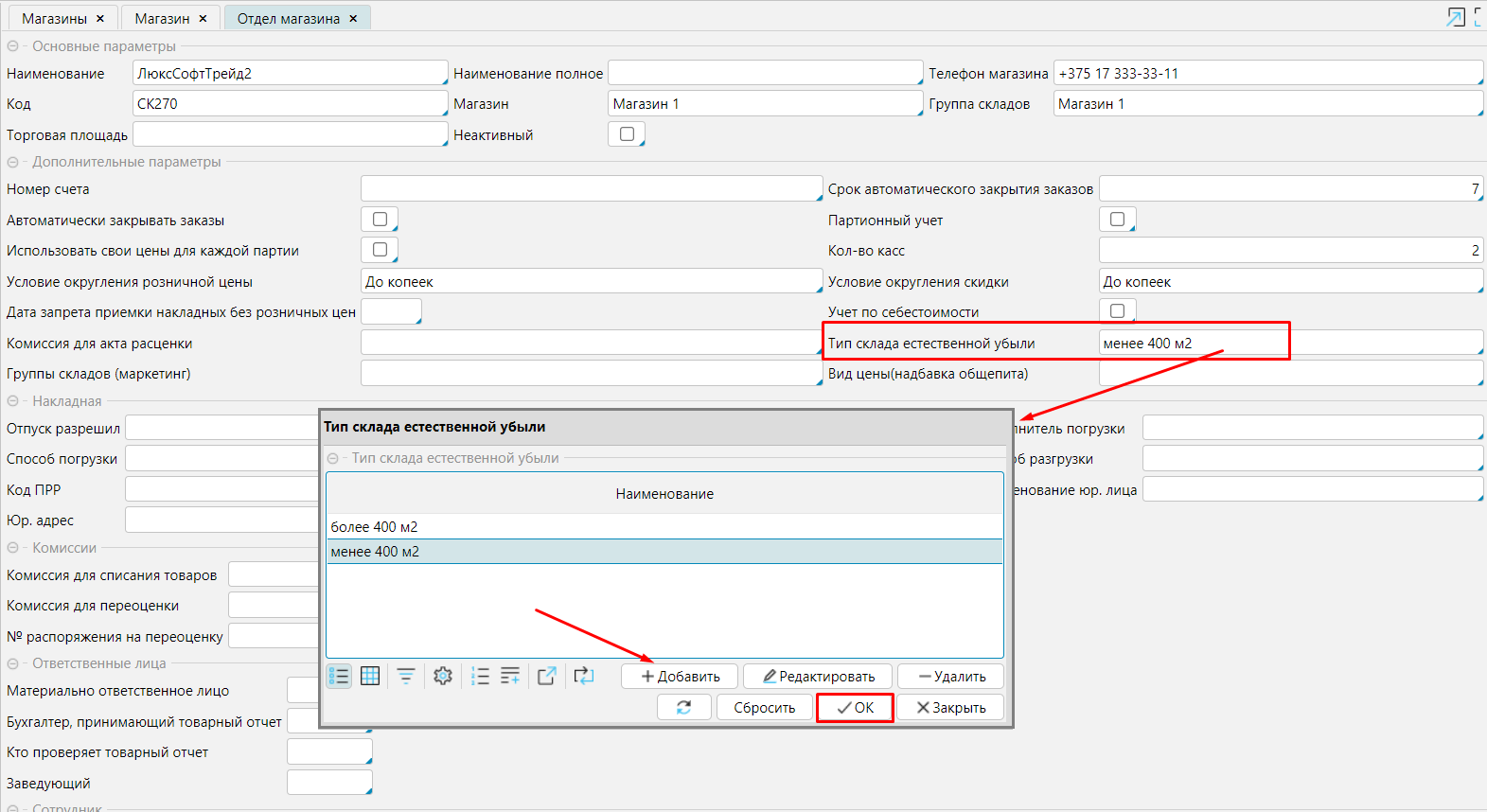 В связи с тем, что нормы естественной убыли в торговых объектах зависят от их площади, необходимо для складов и отделов магазинов указать их принадлежность к Типу склада естественной убыли. Для этого на форме Розничная торговля - Магазины необходимо открыть на редактирование магазин, затем его отдел. Если в справочнике типов складов естественной убыли нет вариантов для выбора, создайте типы складов с помощью кнопки Добавить.