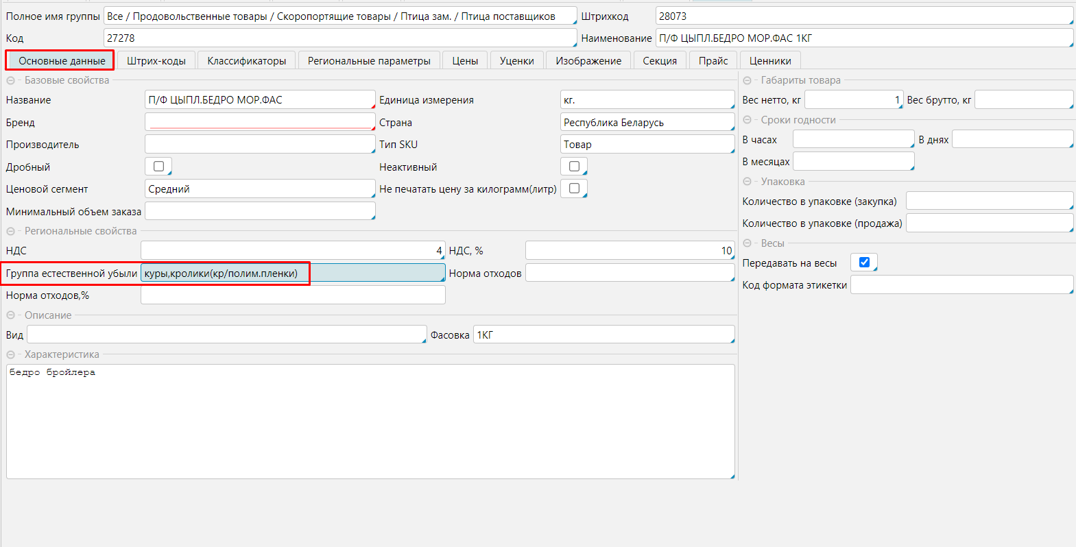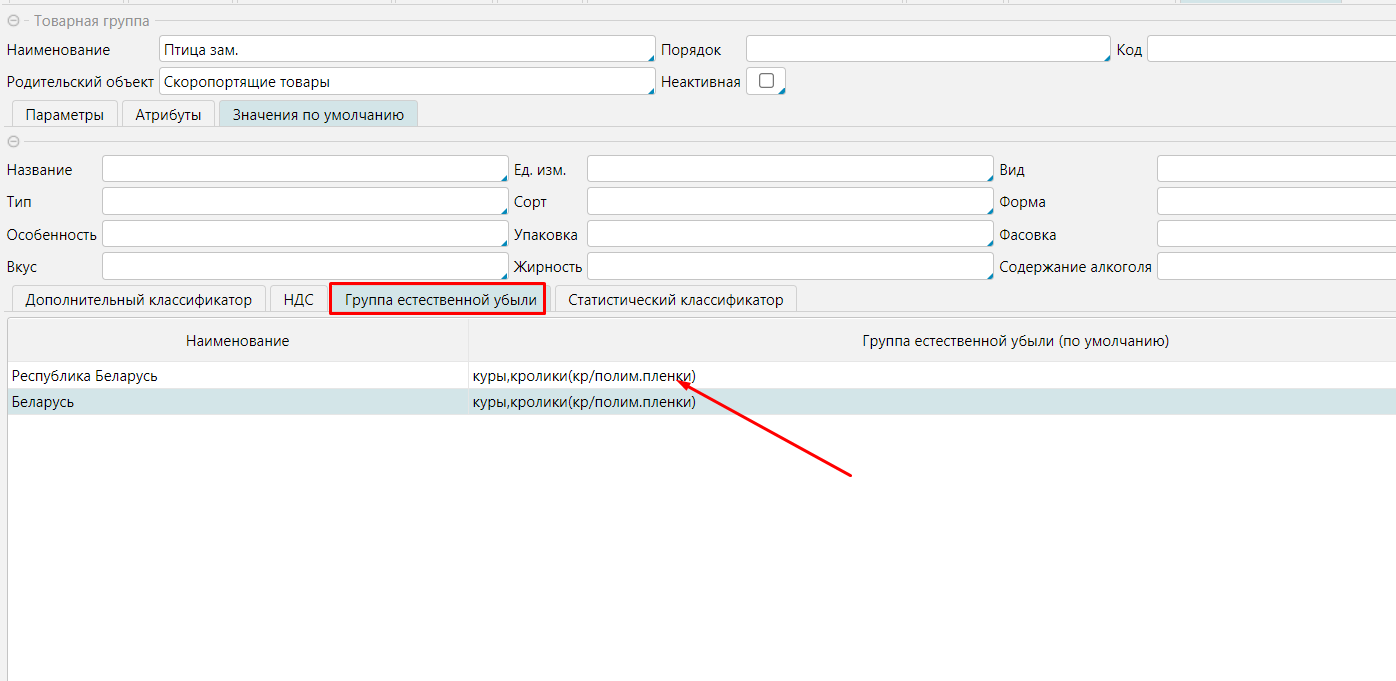 Для товарной группы можно задать группу естественной убыли по умолчанию, которая будет подставляться в карточку товара при выборе товарной группы (Справочники - Товарные группы Редактировать товарную группу).