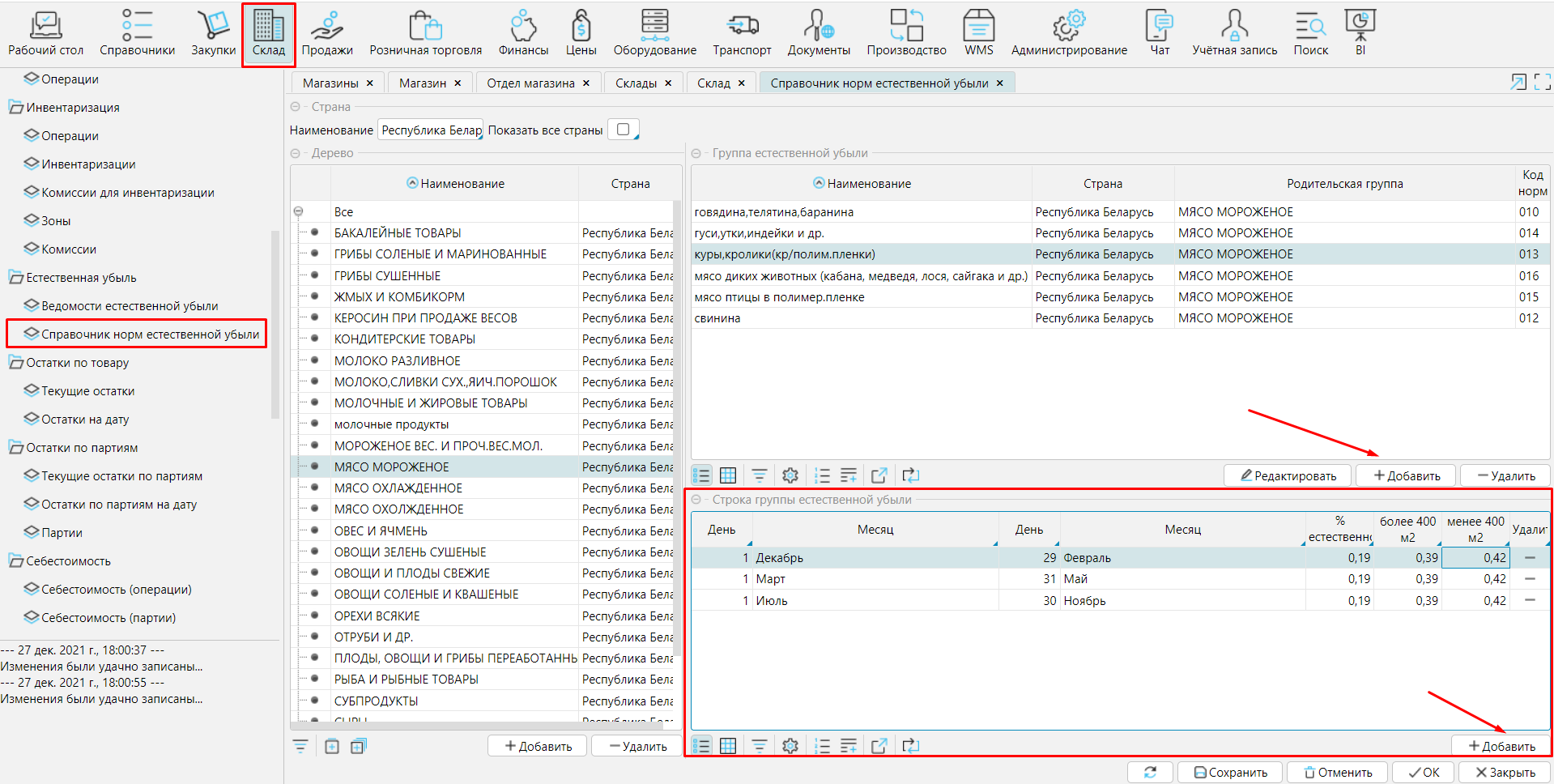 После установки типа склада естественной убыли карточку отдела магазина/склада необходимо Сохранить.