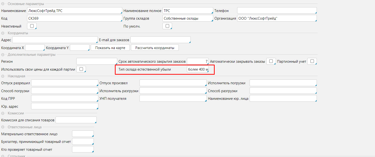 Для склада также устанавливается Тип склада естественной убыли на форме склада (Склад - Склады - Редактировать) (рис. 2).