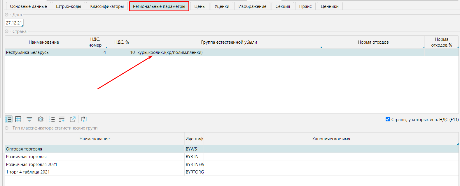Группа естественной убыли задается в карточке товара (Справочники - Товары Редактировать товар).