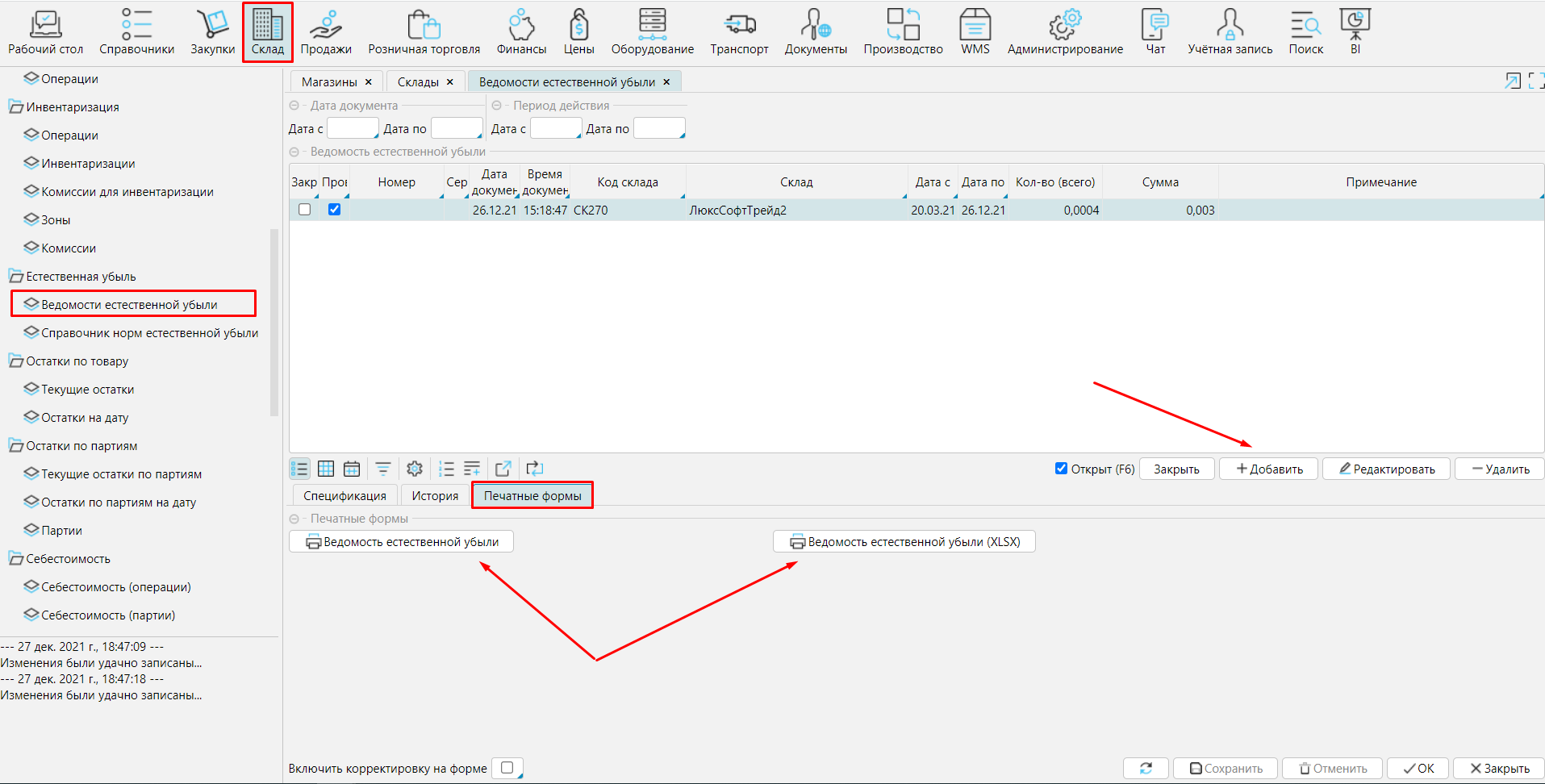 Отчет по естественной убыли формируется на форме Склад - Ведомости естественной убыли. Для формирования отчета нажать кнопку Добавить.