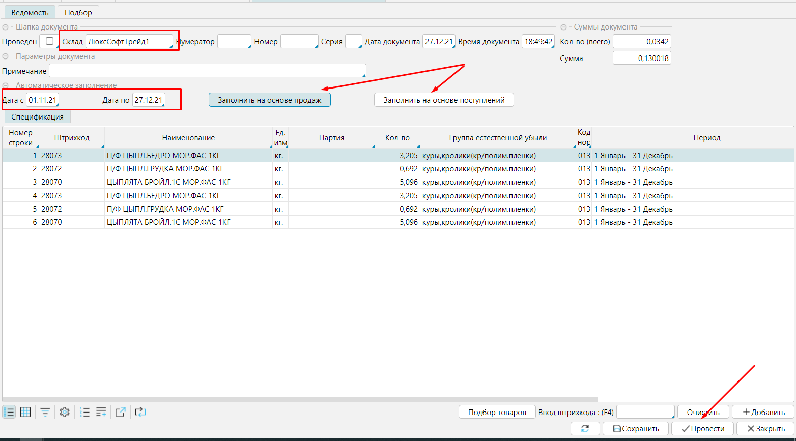 Заполнить шапку (Склад, интервал анализа ), нажать кнопку Заполнить на основе продаж или Заполнить на основе поступлений. Система рассчитает товары и количество убыли по каждому товару на основании ранее введенных норм и документов поступления/продажи.