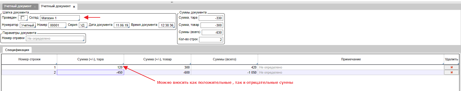 После чего, выбрать склад, заполнить дату документа, добавить строку спецификации и прописать суммы. Нажать кнопку Провести.