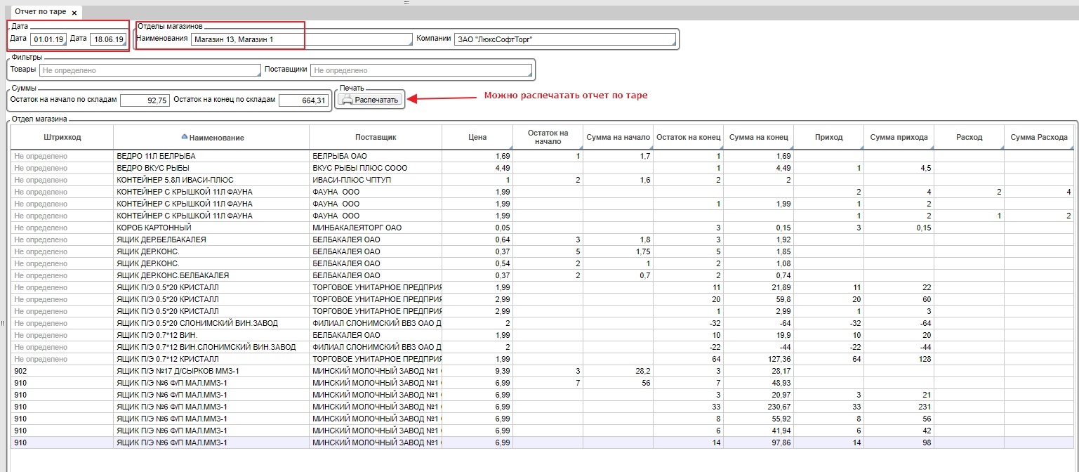 Исходя из введенных фильтров, можно распечатать отчет по таре, нажав на кнопку Распечатать.
