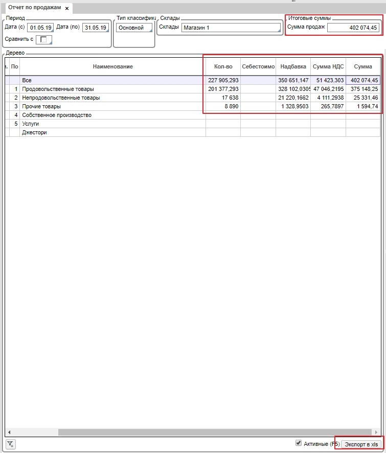 Для выбранного классификатора рассчитываются итоговые суммы, которые при желании можно экспортировать в Excel (кнопка внизу таблицы).