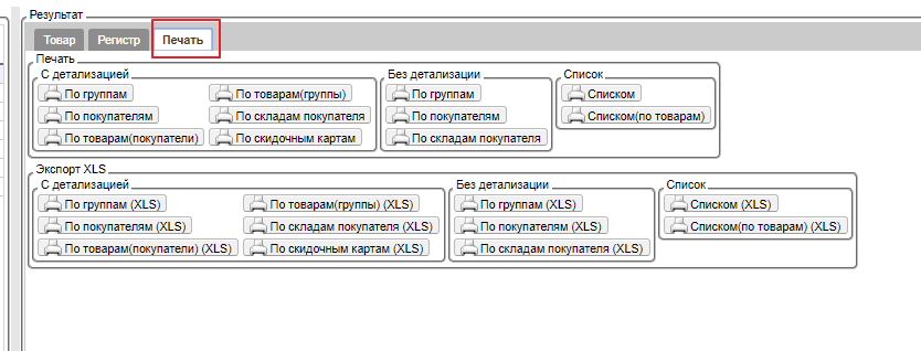 На закладке Печать располагаются кнопки, нажав которые, получите соответствующую печатную форму с данными, согласно выбранных ранее параметров.