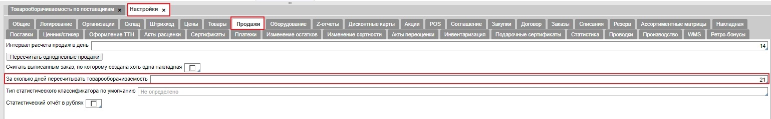 По нажатию кнопки товарооборачиваемость перерассчитывается за кол-во дней указанных в Администрирование - Настройки