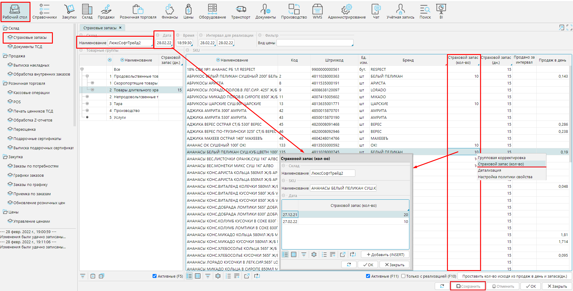 Вручную размер страхового запаса вводится в колонку Страховой запас (кол-во) для конкретного товара отдельного магазина (поле Наименование), на определенную дату и время (поля Дата и Время). После введения значения необходимо Сохранить изменения на форме. Установленный страховой запас действует до даты и времени, когда будет задано новое значение. Историю изменения страхового запаса можно посмотреть вызвав правой кнопкой мыши контекстное меню и нажать Страховой запас (кол-во).