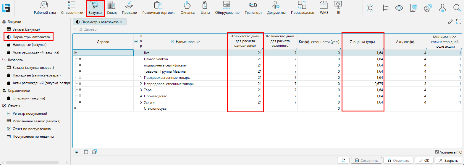 Параметры Z-оценка (упр.) и Количество дней для расчета однодневных продаж указываются на форме Закупки\Закупки\Параметры автозаказа. Значения могут быть определены как для всего товара, так и для подгрупп основного классификатора товаров.