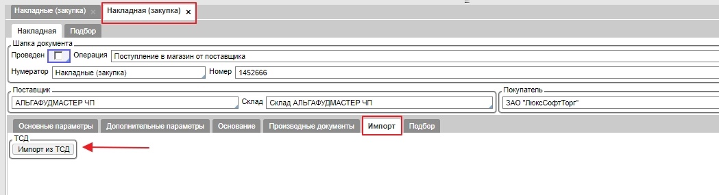 В форме ввода документа есть закладка Импорт и кнопка Импорт из ТСД