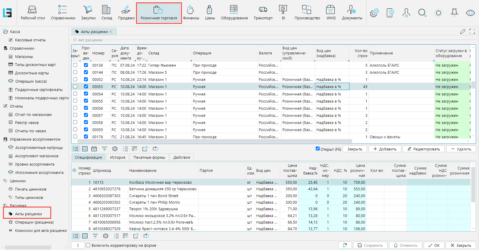 Вид цен акт расценки (управленческий) - это приоритетный вид цен для розничной расценки, он применяется в первую очередь. В данном поле можно выбрать любой вид цен - расчетный, пользовательский, системный.