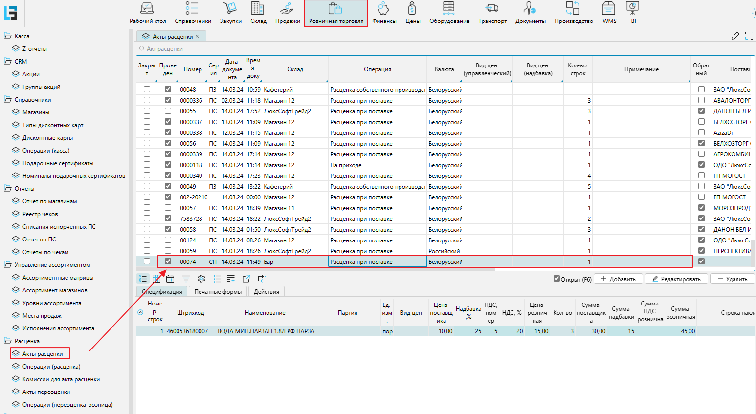 Акты расценки документов Списания формируются, как производные документы (Списание товара/тары по актам, Списание техпотерь и т.д.) и автоматически записываются в журнал Розничная торговля\Акты расценки.