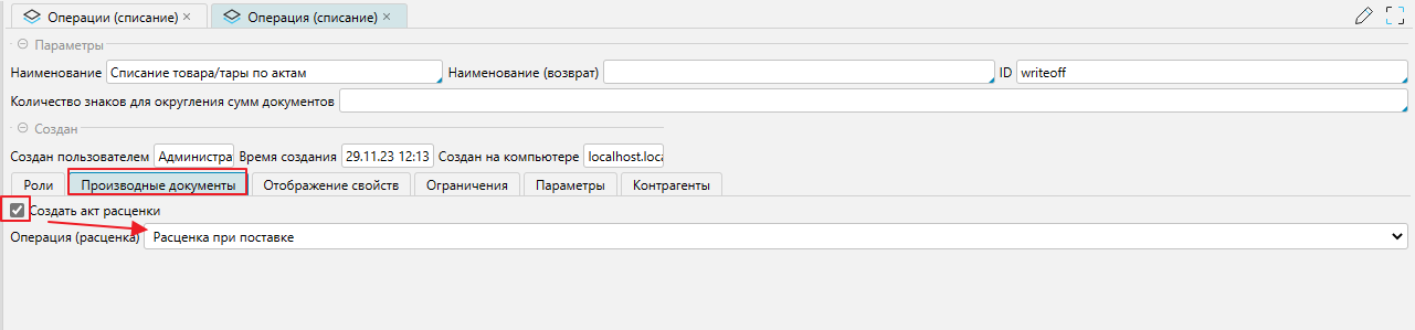 Для включения настройки необходимо включить (поставить галку) в закладке Производные документы "Создать акт расценки" и выбрать подходящую "Операцию (расценка)"