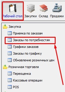 Заходим на форму Заказы по потребностям модуля Рабочий стол