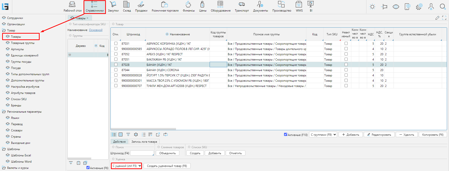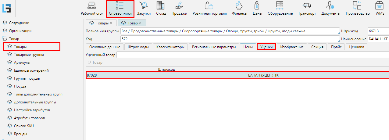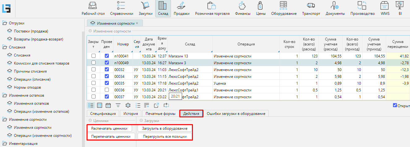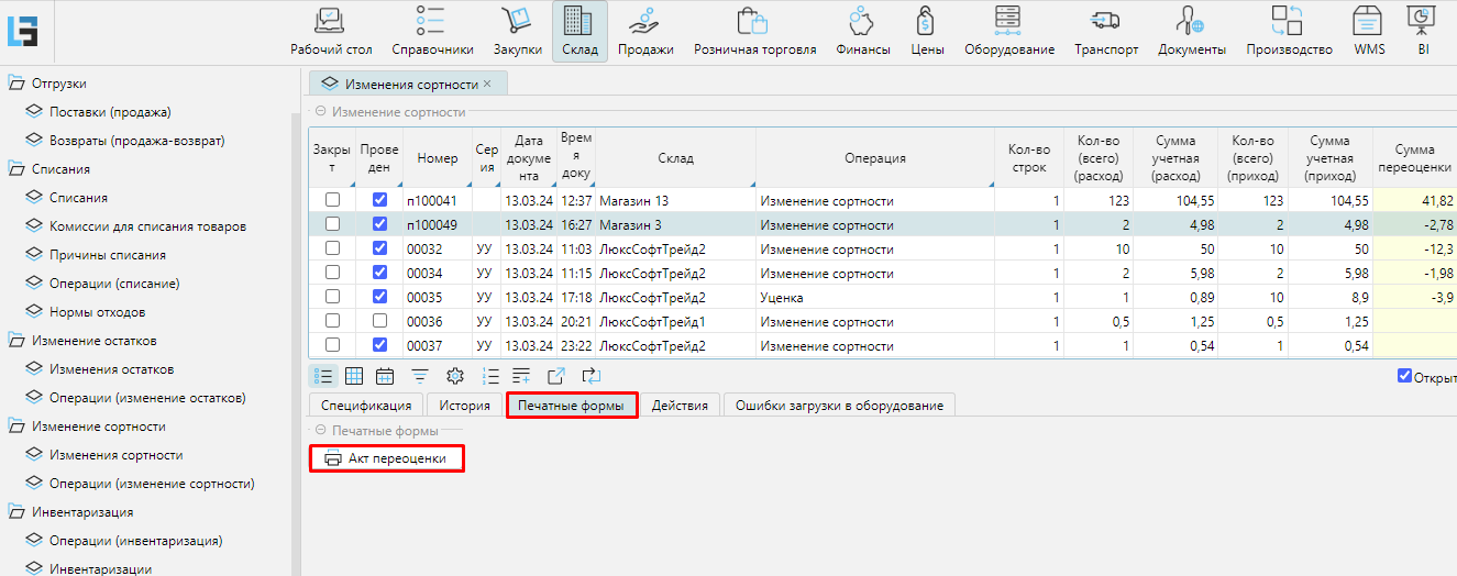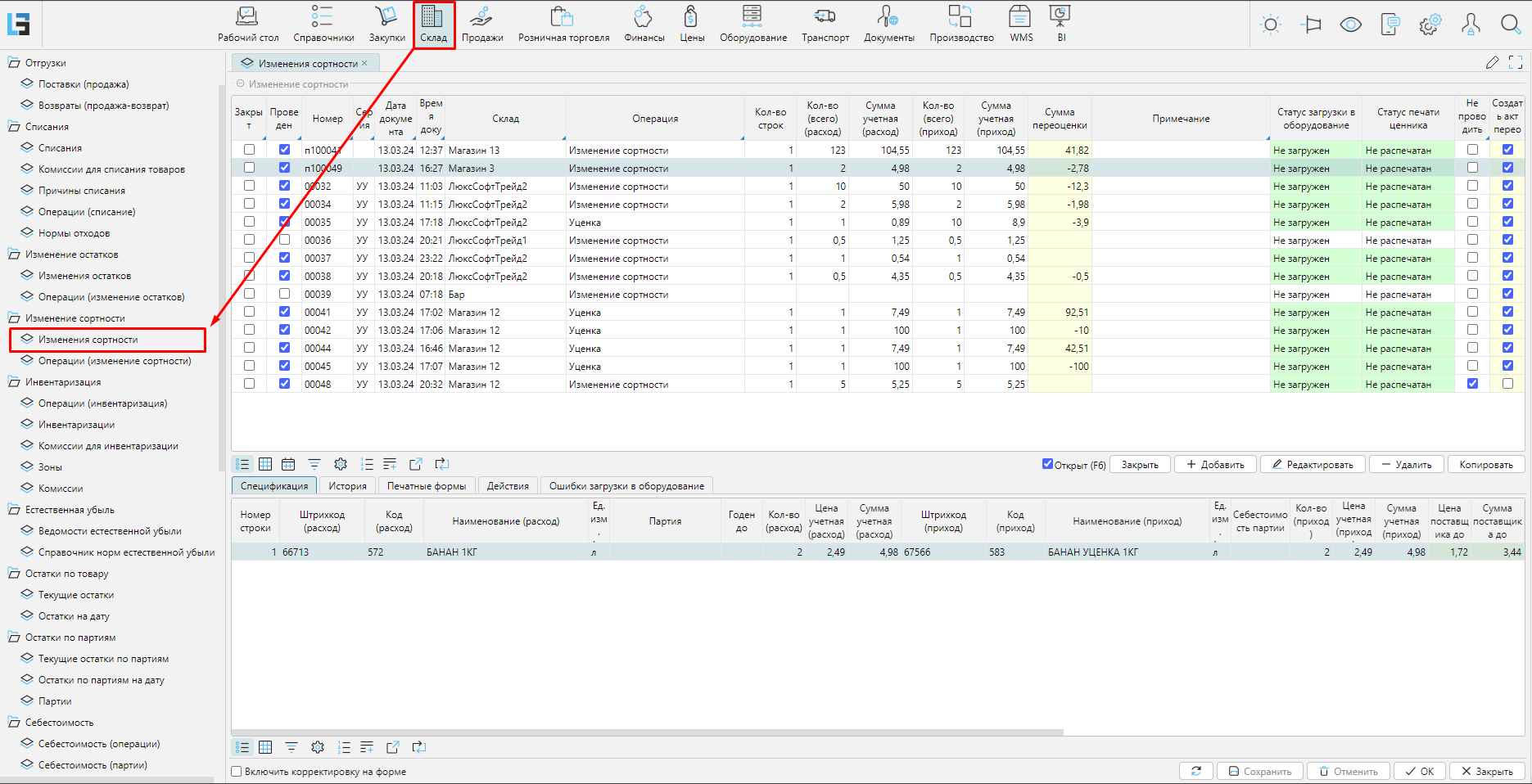 Управление документами Изменения сортности товара, из которых в последствии формируются автоматические документы уценки товаров располагаются в журнале Склад\Изменение сортности: