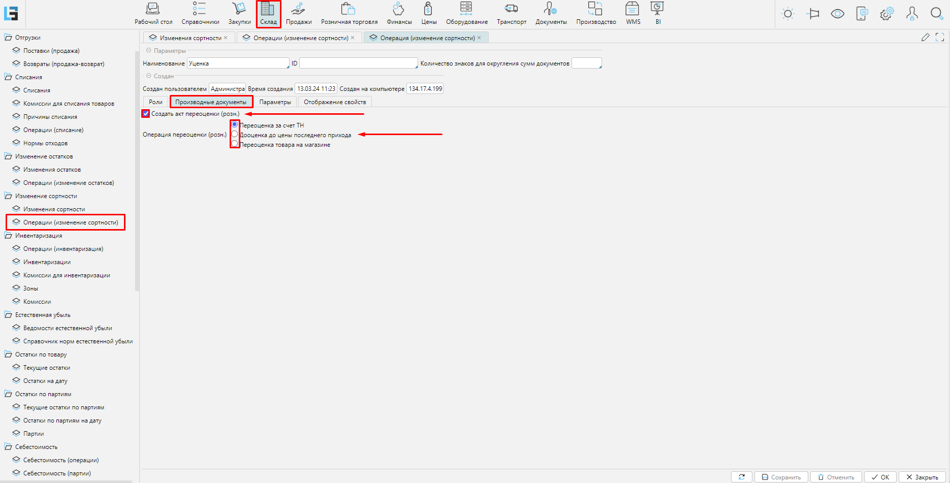 Автоматическое создание документов уценки можно включить и настроить на форме "Операции (изменение сортности)". Документ уценки представляет собой документ "Акт переоценки" с предустановленным набором параметров и списком товаров по аналогии с родительским документом изменения сортности. Настройка осуществляется на вкладке "Производные документы" в режиме редактирования операции в журнале Склад\Операции (изменение сортности). Настройки представлены признаком "Создать акт переоценки (розн.)", при включении которого будет автоматически формироваться документ уценки при проведении документа изменения сортности, и полем "Операция переоценки (розн.)", в котором устанавливается операция для формируемого документа уценки: