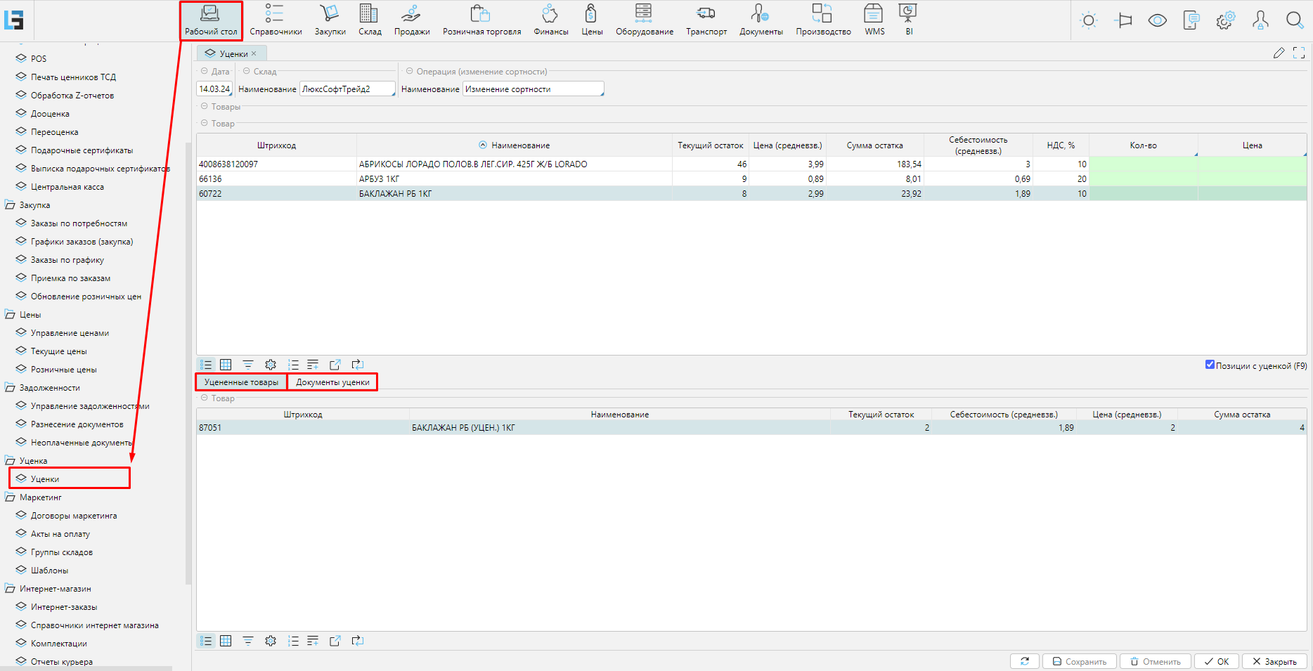 Также имеется дополнительный модуль управления уценками с соответствующей формой. На форме Рабочий стол\Уценки имеется возможность просмотреть уцененный товар и документы уценки, созданные автоматически: