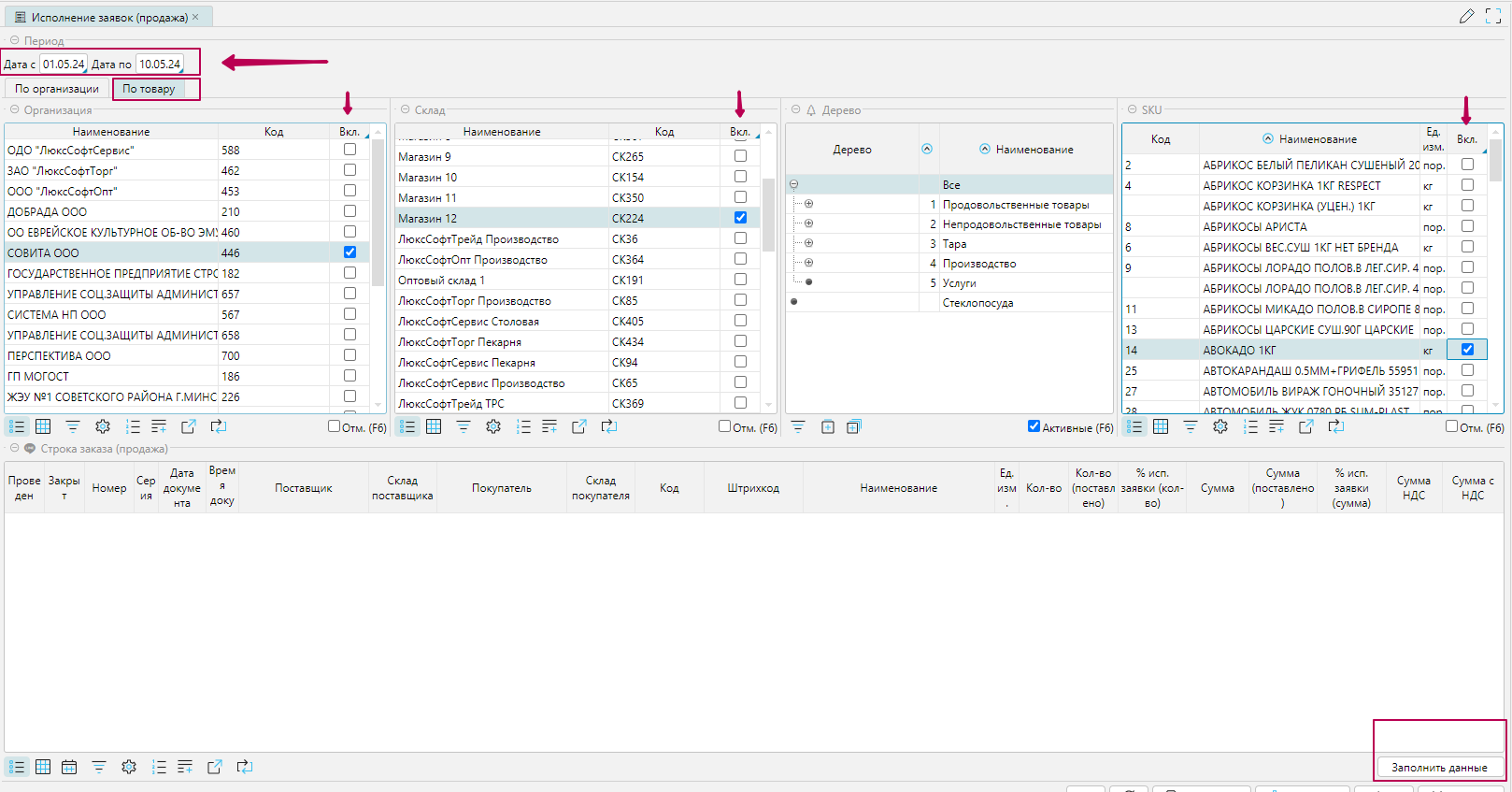 На форме доступны фильтры по организации, складу, группе товаров, товарам. Указав нужные признаки для фильтрации, необходимо нажать кнопку "Заполнить данные". После выполнения в нижней части формы "Строка заказа(продажа)" появится информация.