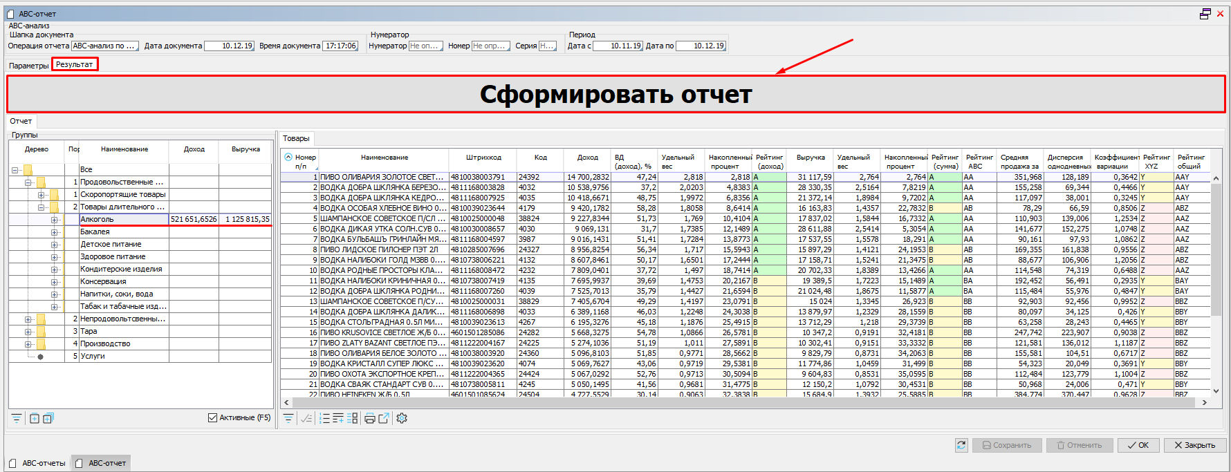 Далее надо перейти на вкладку "Результат" и нажать кнопку "Сформировать отчет". В результате на вкладке "Товары" будут отображены записи, содержащие сумму полученной Выручки и Дохода за указанный период. Также виден Удельный вес, % каждого товара в общей сумме (Выручки/Дохода) выбранной группы. Рейтинг для этих показателей формируется путем ранжирования товаров по сумме (Выручки/Дохода). Уровень рейтинга (A,B,C) назначается с учетом процентов, указанных в параметрах отчета и Накопительного процента, который, в свою очередь, получается путем складывания удельных весов.
