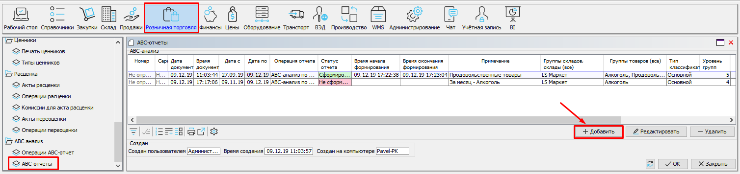 Для создания отчета вручную, на форме Розничная торговля\ABC анализ\ABC-отчеты надо нажать кнопку "Добавить".