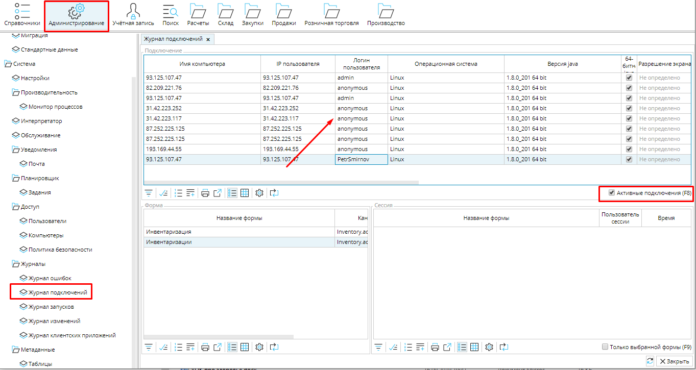 Если лицензионное соглашение содержит условие по количеству конкурентных пользователей, то данное ограничение распространяется на количество пользователей, использующих десктопное приложение и/или web-интерфейс.  При определении количества подключений  подсчитываются только активные подключения пользователей к серверу приложений и не учитываются подключения с терминалами сбора данных (ТСД). Текущие подключения пользователей можно просмотреть на форме Журнал подключений в модуле Администрирование