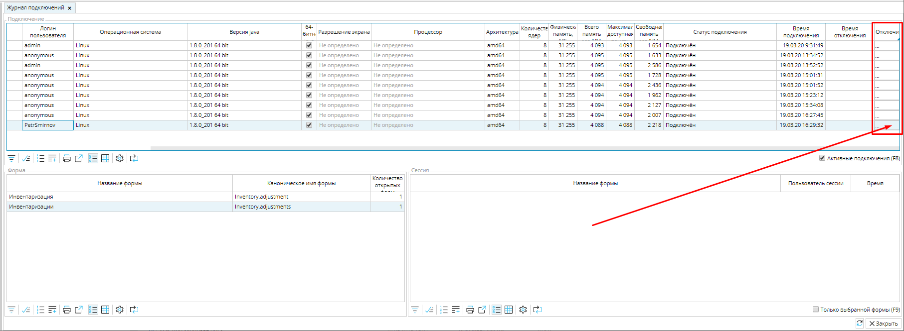 Если сеанс работы пользователя был завершен некорректно, например из-за технических неполадок, сбоев связи или питания, то он может все еще числится активным на сервере приложения (длительность такого периода устанавливается в настройках сервера приложения и по умолчанию составляет 30 минут).  При ограниченном количестве одновременных пользователей  в такой ситуации может возникнуть необходимость принудительно завершить "зависший" сеанс. Для этого в блоке Подключение формы Журнал подключений необходимо нажать кнопку Отключить  для пользователя, завершившего свою рабочую сессию.