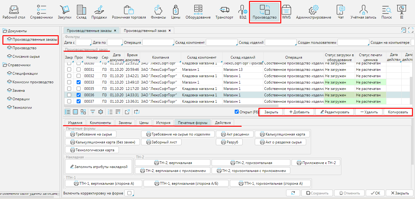 Для создания, удаления и корректировки заказов используются кнопки Добавить, Копировать, Редактировать, Удалить