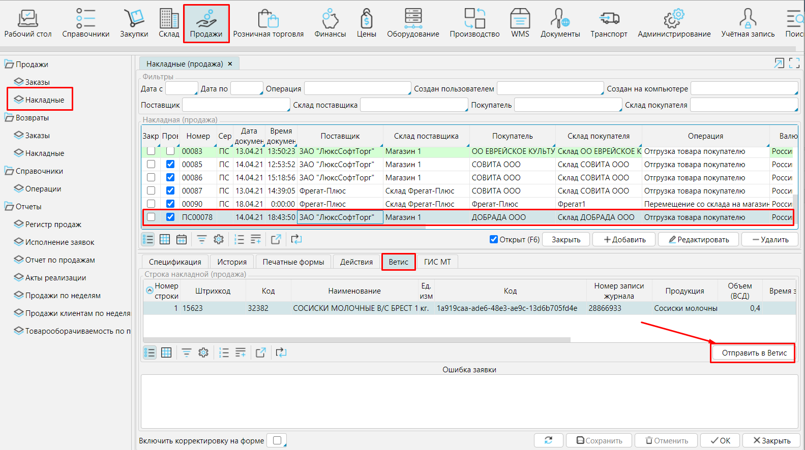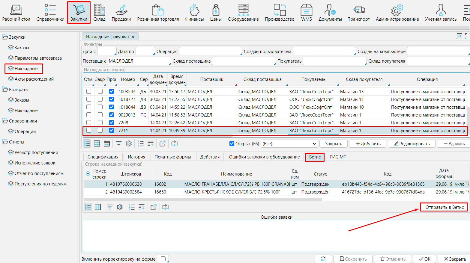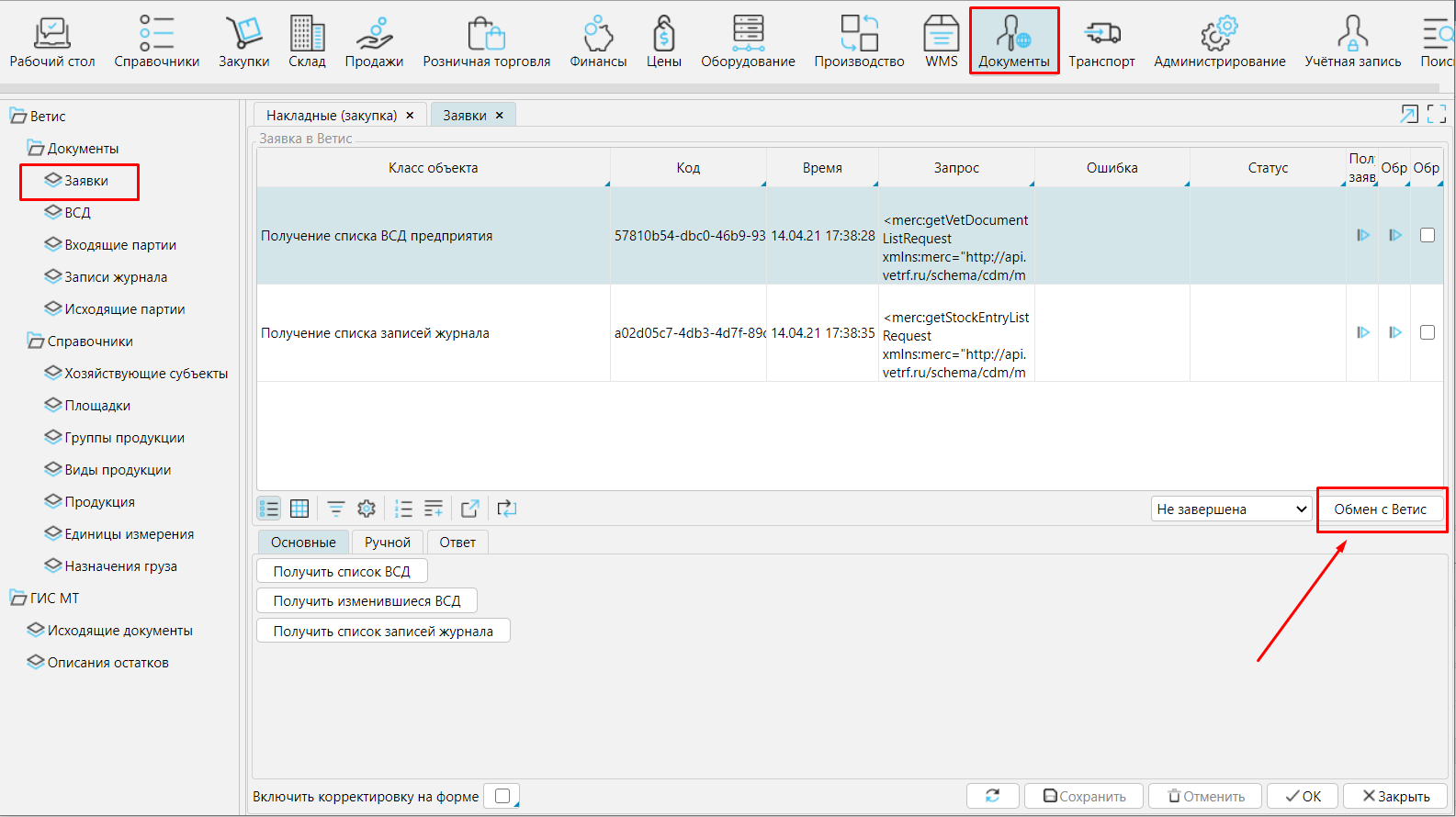 - По установрленному в программе графику будет получет ответ из ФГИС "Меркурий".  Если необходимо получить ответ незамедлительно, на форме Документы - Заявки надо использовать кнопку Обмен с Ветис.