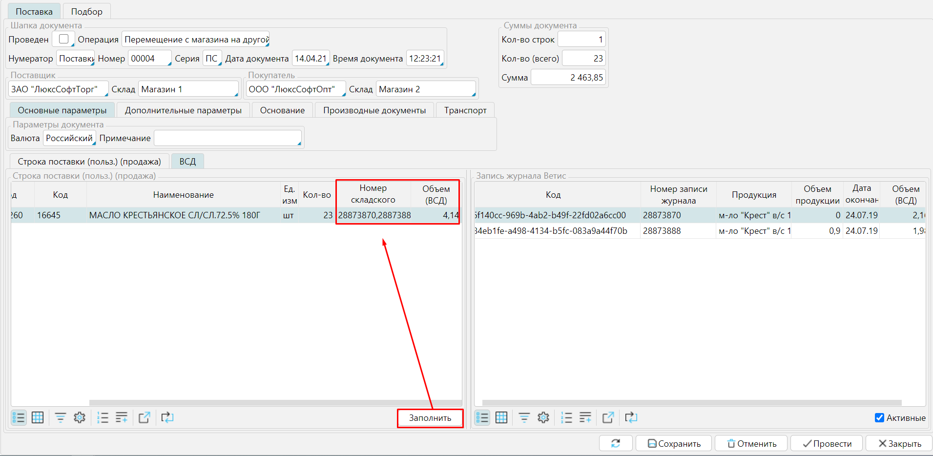 Внутреннее перемещение отгружается документом поставка(продажа) (Склад - Отгрузки - Поставки )по правилам, описанным в пункте Расходная накладная. Для оприходования внутреннего перемещения необходимо:
