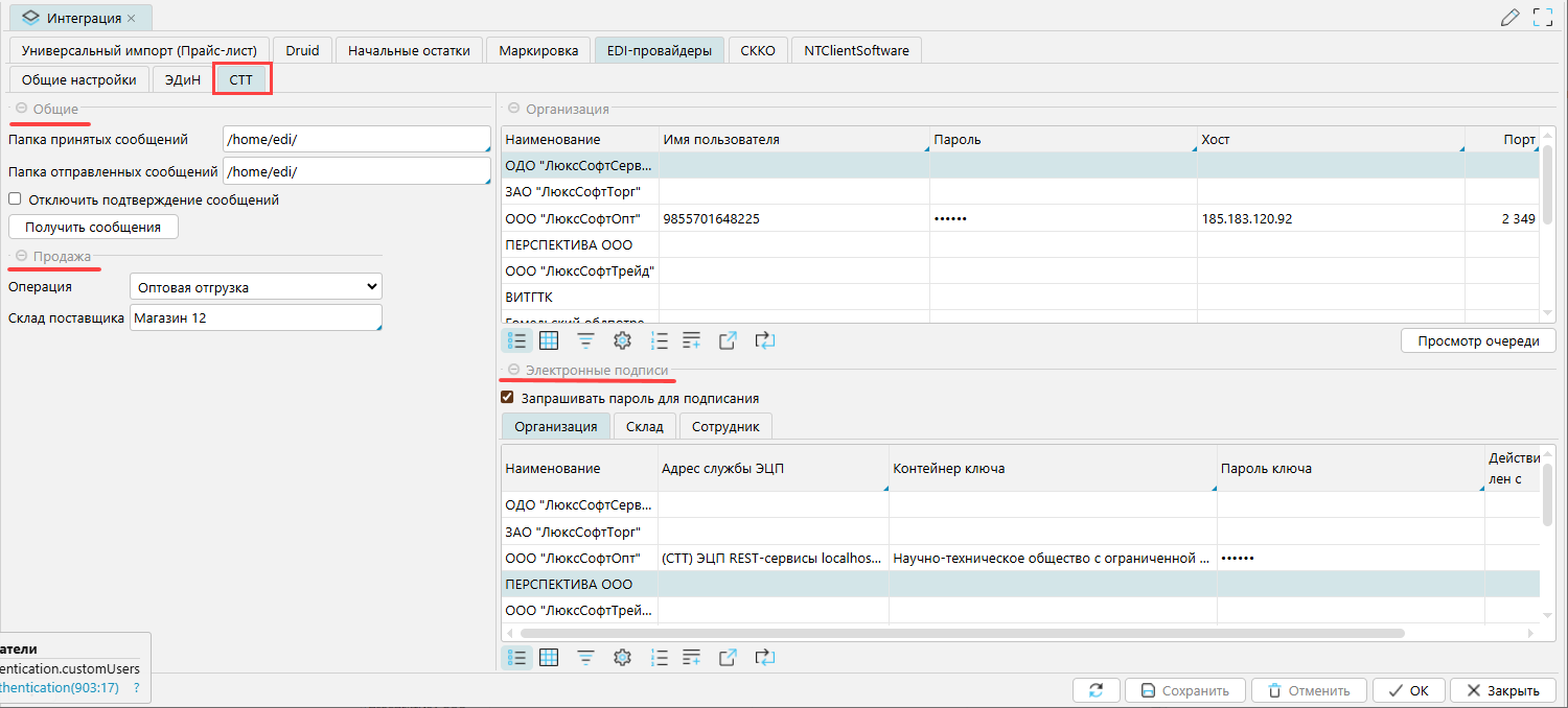 lsFusion ERP интегрирована с EDI системой TOPBY (аттестованным EDI-провайдером является ООО «СТТ») и с системой ЭдИН (провайдер ООО "Электронные документы и накладные"). Для использования электронных документов необходимо подключится к TOPBY или ЭдИН .