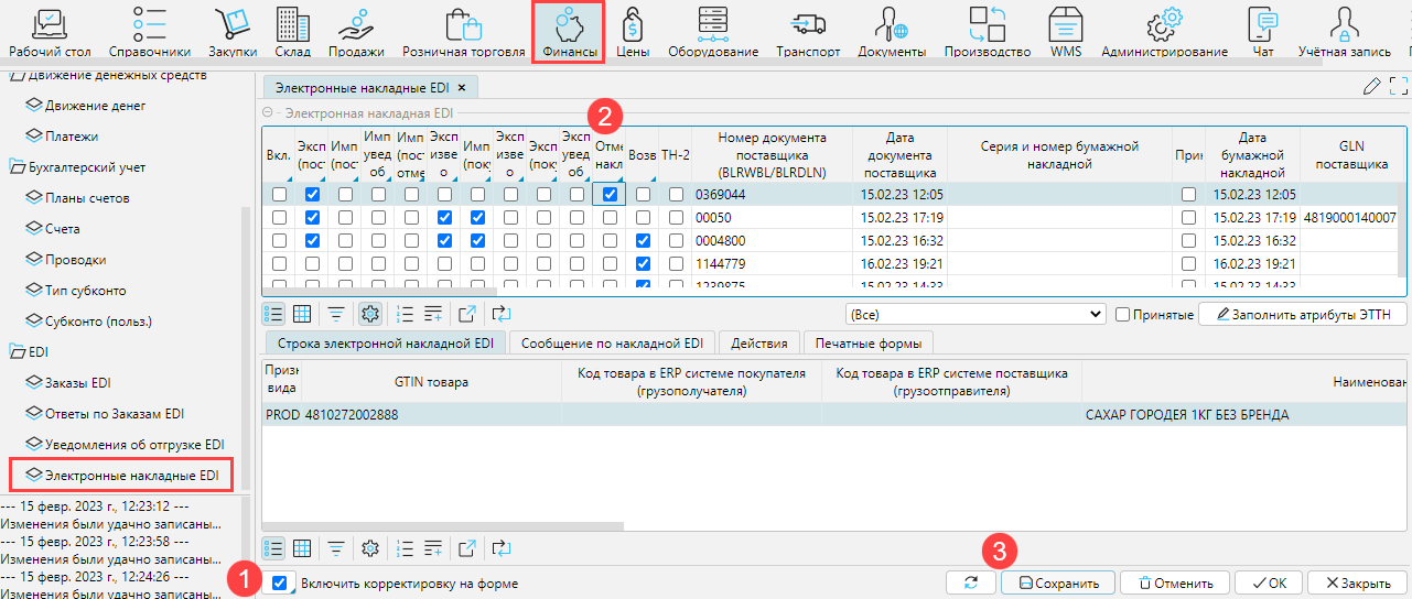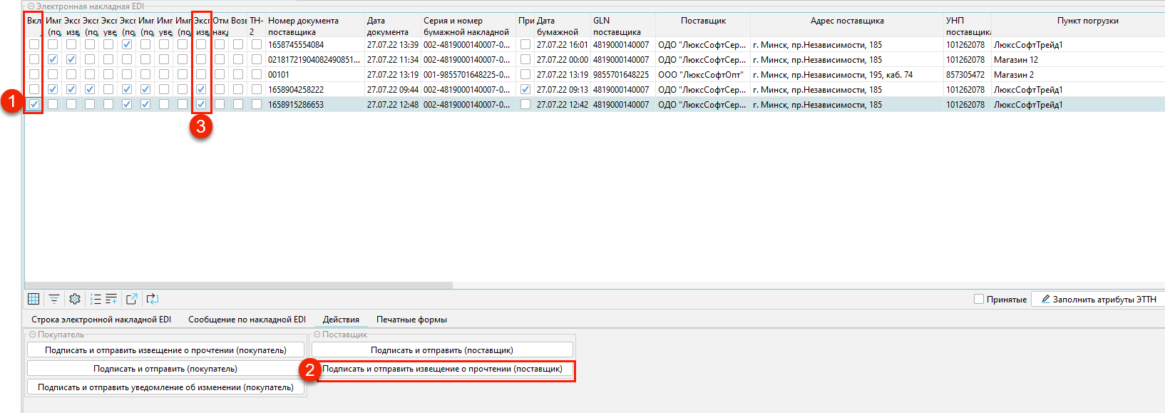 3. После получения подтвержденной накладной от покупателя, вы должны отправить извещение о получении накладной. На форме Финансы - EDI - Электронные накладные EDI нужно выделить накладную (1) и нажать Подписать и отправить извещение о прочтении(поставщик) (2). В строке накладной появится галочка Экспортировано извещение о прочтении (поставщик) (3).