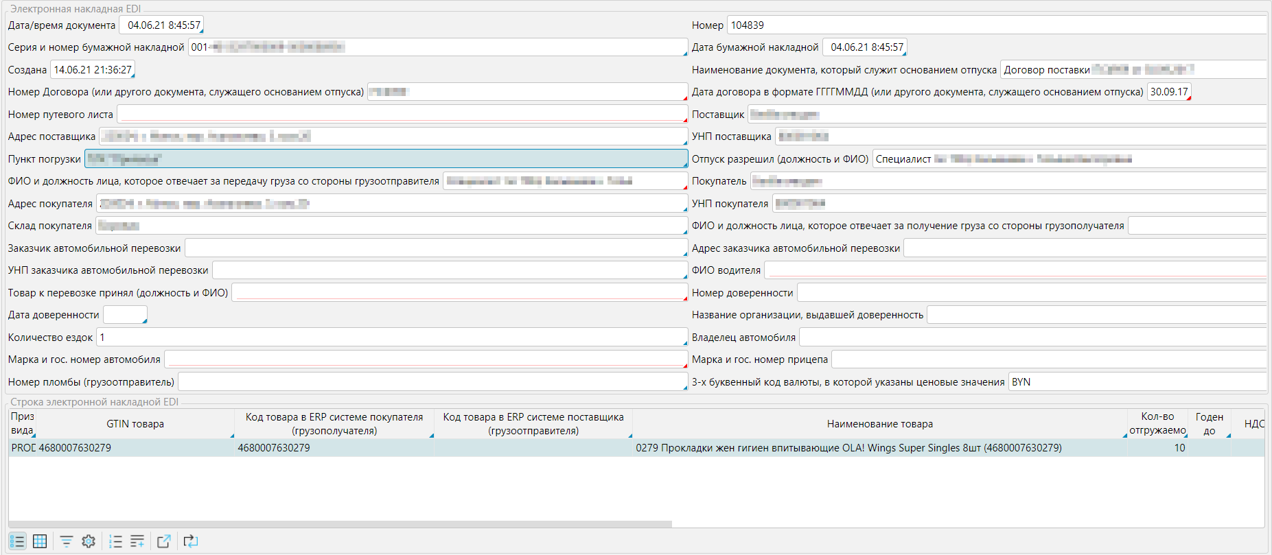 Обратите внимание, что в электронной накладной должны быть заполнены все атрибуты, вплоть до трехбуквенных кодов валюты. Большая часть полей заполняется из накладной и справочников:
