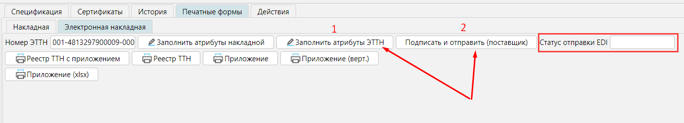 Для отправки электронной накладной нужно нажать Подписать и отправить (поставщик). Электронная накладная будет подписана вашей ЭЦП и направлена покупателю.  В поле Статус отправки EDI будут отображаться сообщения об ошибках при отправке, если такие были или  код /сообщения об успешном выполнении этапов работы с электронной накладной.